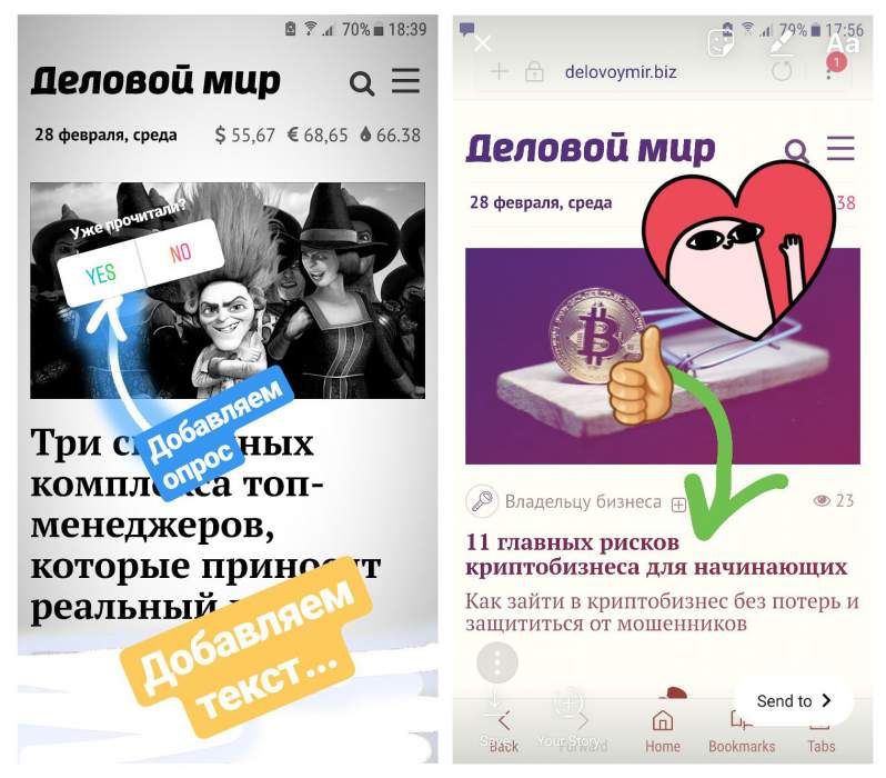 - вертикальное информационное наполнение, изучение которого не затруднено функционированием большого количества элементов интерфейса (дополнительный бонус: контент в Историях демонстрируется в формате автоматического перелистывания отдельных информационных блоков);