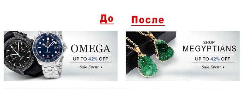 ЗАДАНИЕ: Нужно заменить часы на драгоценности и заменить надписи. Ниже показано как было и как произвелась замена, сохранив стиль баннера.